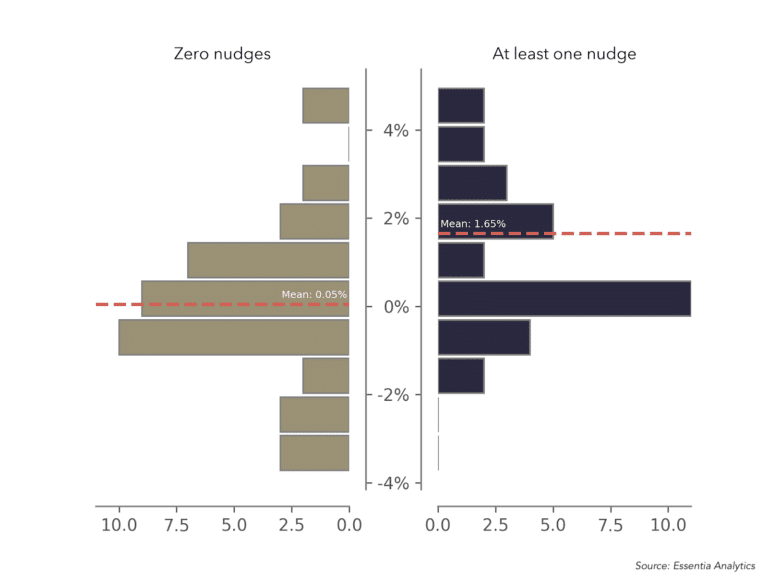 Essentia Analytics, which provides behavioral data analytics and consulting for professional investors, found a 160 basis point annualized relative performance between managers who engaged with nudges and those who did not.