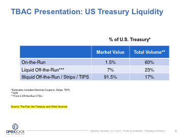 You are looking at a page taken from the presentation itself (slide 3) in which the TBAC presenter pointed out that there were clear tiers of liquidity in the Treasury market, with 60% of trading activity in the dealer-to-client space concentrated in OTRs, and 40% in OFTRs. In addition, this presenter drilled down into more detail to liquid vs illiquid OFTRs, and stated that within that 40% bucket that 23% of OFTRs were considered “liquid” and the remaining 17%, illiquid.