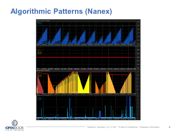 When I think about the 1.5% that is traded and not held, I think about a Ted talk, given by Kevin Slavin. Kevin talked about how algorithms are quite literally shaping our world. He mentioned a company many of you are probably familiar with, Nanex. One thing, among a whole host of things, Nanex does is look for algorithmic patterns in financial markets, and when they find them, they put them into a graphic representation, that looks a lot like art (slide 4).