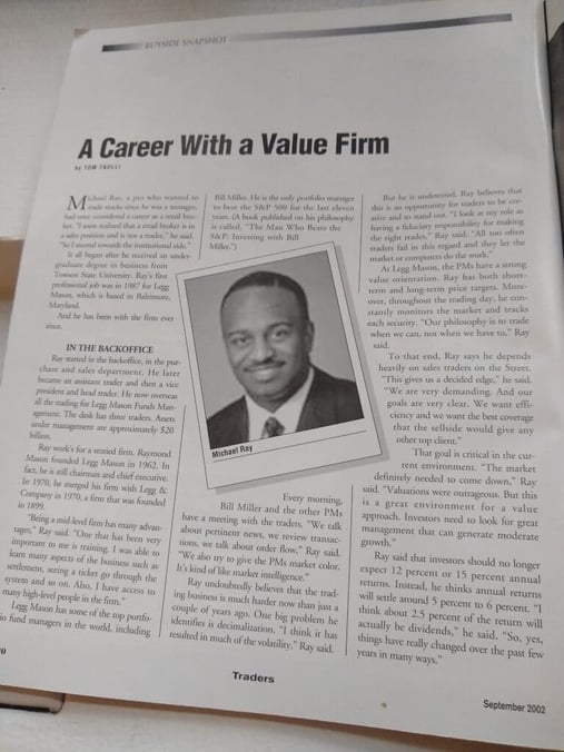 Michael Ray was featured in the September 2002 Traders Magazine. In "A Career With a Value Firm," Ray, then a trader for Legg Mason, discussed trading and markets, as well as his own career in the industry.