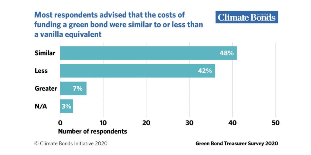 The majority, 70%, of respondents said the demand for their green bonds was higher than for vanilla equivalents while nearly half, 42%, said green bond costs were lower.