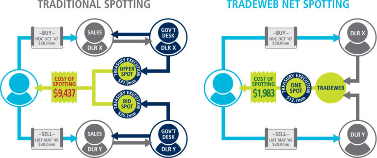 Traditional spotting workflow would have Katie pricing these bonds separately and receiving two Treasury spot prices – one at the bid side and one at the offer side. By utilizing Tradeweb’s Net Spotting, both of Katie’s trades would both be spotted at one price instead of having to pay the bid/ask on the Treasury bond. That is savings of $7,881! This kind of cost savings was not possible without advancements in technology. Imagine the cost savings to the marketplace if all eligible volume was netted.