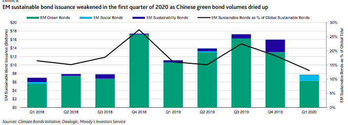 “Increased issuance in Latin America somewhat offset declines in Chinese green bond volumes as Chile's large sovereign green bond helped support EM issuance,” added Moody’s. “EM sustainable bond volumes will be subject to similar headwinds as the broader market throughout the year as economic contraction because of the coronavirus outbreak causes prolonged market disruption and potentially weighs on investor sentiment.”