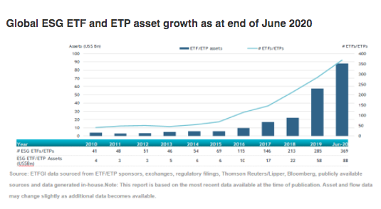 The first ESG ETF/ETP was launched by iShares, now owned by BlackRock. Last month BlackRock said it had record flows of $11bn into U.S. iShares sustainable ETFs in the first half of this year, more than doubling the previous mark of $5bn for all of 2019.