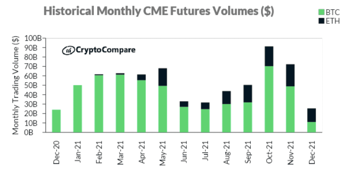 However, data provider CryptoCompare highlighted that CME’s bitcoin futures volumes experienced their biggest monthly decrease in December as the price of bitcoin fell.