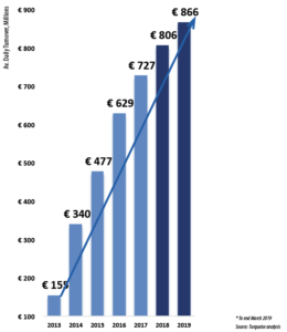 Turquoise Plato’s average daily turnover in Q1 2019 continues its trend of tremendous growth (Figure 2) by offering investors a single order book of multiple functionalities – continuous trading for immediacy and periodic random uncrossing featuring low price reversion after the trade – where pre-trade, no price nor size information is displayed to minimise market impact, and where after a trade, all price and size information is broadcast real-time to all market participants.