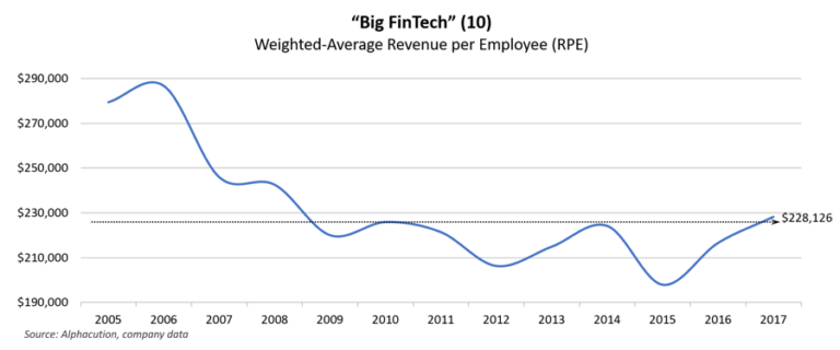 Alphacution estimates that the CRD valuation is $3.1 million per employee; the Eze valuation is $1.4 million per employee. Based on a weighted average index of 10 public Big FinTech* companies, Alphacution also estimates that each employee in the software solutions arena generated $228,126 in revenue for 2017 - a level that has not been exceeded since 2008 (see chart below).