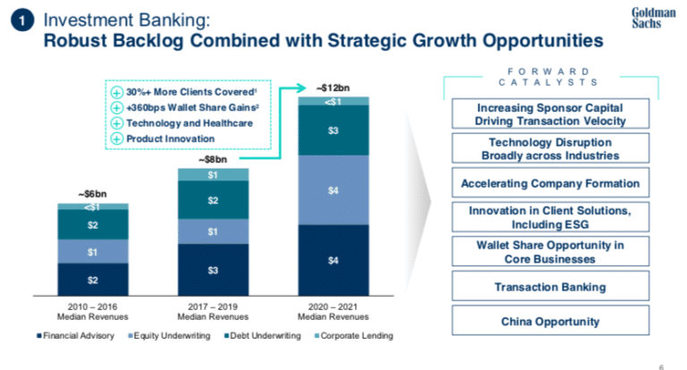 In his presentation Solomon said median revenue in investment banking between 2020 and 2021 was $12bn, compared to $8bn between 2017 and 2019 and $6bn between 2010 and 2016.