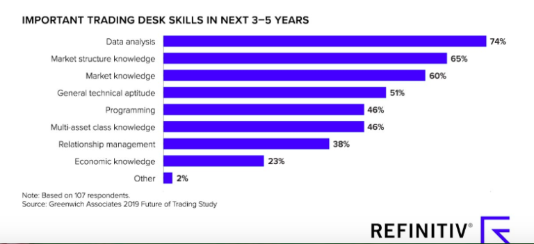 As a result the majority, 57% of capital markets professionals expect to spend more time analyzing data, and 74% believe data analysis is the most important skill required to work on the future trading desk.