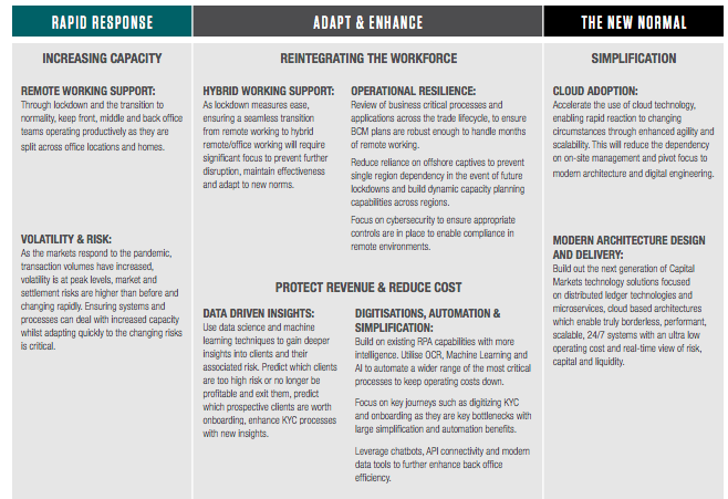 “We will see an acceleration in the use of cloud technology to allow faster responses to changing circumstances via enhanced agility and scalability,” added the report. “This will reduce firms’ dependency regarding ‘on-premises’ infrastructure (and its management), allowing them to pivot their focus and resources to modern architectures and digital engineering.”