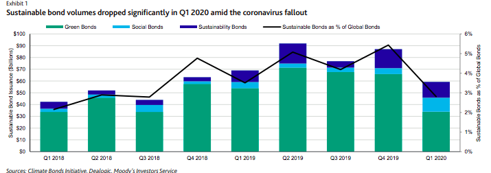 The ratings agency said in a report that global sustainable - green, social and sustainability - bond issuance was $59.3bn (€55bn) in the first three months of this year, 14% lower than a year ago due to the spread of the coronavirus pandemic.