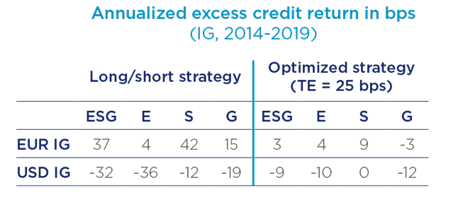 The research found that since 2014, the credit return of the long/short strategy between the 20% best-ranked ESG bonds and the 20% worst-rated bonds is positive in euro-denominated investment grade bonds for both the ESG global score and the three individual pillars of environmental, social and governance. Buying the best-in-class ESG-rated bonds and selling the worst would have generated an annualized performance of 37 basis points between 2014 and 2019.