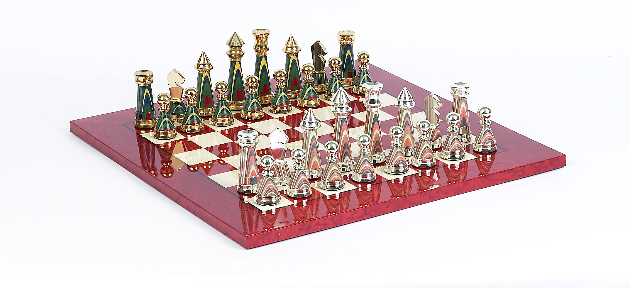 Sofisticato Chessmen. Italian crafted, handmade solid brass chessmen plated in 24-carat gold on one side and solid brass, .925 silver-plated chessmen on the other, wrapped in stained, shaved Italian maple. Set against a high-gloss, lacquered chessboard made in Spain, this chess set's luxurious high drama should distract your opponent just enough to allow you to execute that perfect move. Sofisticato Chess Set, $795. www.bellogamesnewyork.com