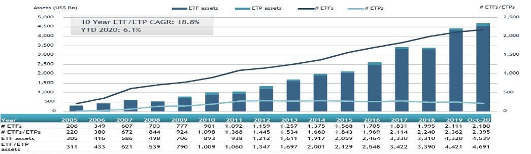 The US ETF/ETP industry had 2,395 ETFs/ETPs, assets of $4.69 Tn, from 167 providers on 3 exchanges at the end of October 2020.